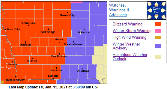 .Strong and gusty northwest winds coupled with moderate to at times heavy snowfall will continue to produce blizzard to near blizzard conditions into the daylight hours today over the western half of Iowa. Significant travel impacts are occurring or expected, especially along Interstate 35 and Interstate 80 in western Iowa. Over the eastern half of Iowa, lighter winds and lower snowfall amounts are forecast, but hazardous travel is anticipated.