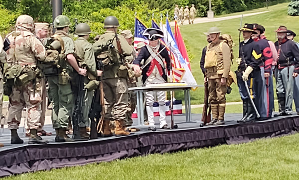 Volunteers dressed in uniforms of soldiers through various periods of the Army’s 250 years cut a birthday cake at Camp Dodge. (RI photo)