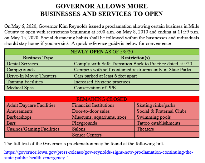 Thanks to the Mills County Emergency Management Agency for providing this quick snapshot of the changes coming Friday, May 8th, as a result of the Governor’s proclamation on May 6th (this applies to all counties except those otherwise noted):