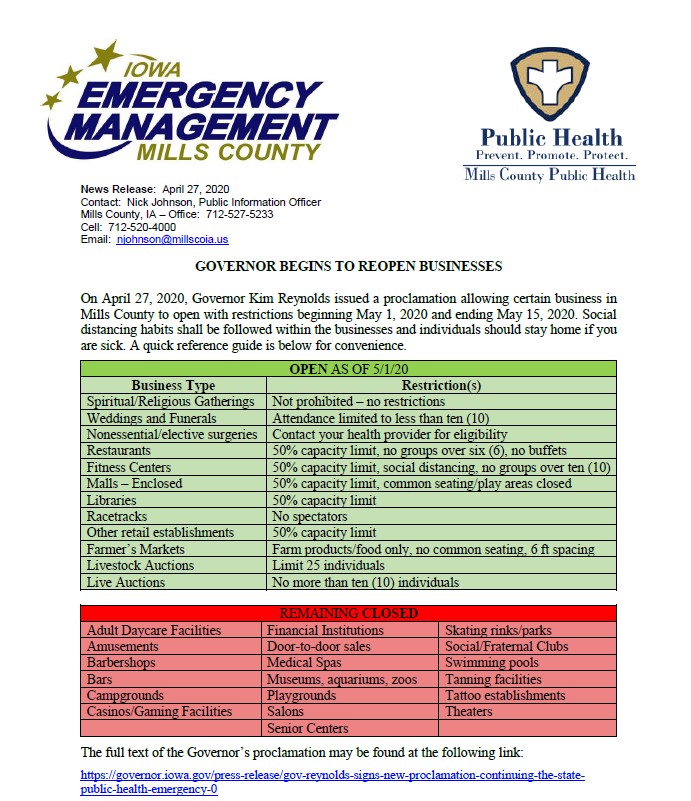 Yesterday (Monday), Governor Reynolds announced restaurants, bars, fitness clubs and retail businesses in 77 Iowa counties may reopen on May 1st. The four counties that are adjacent to Woodbury County are included in that opening-for-business zone.
