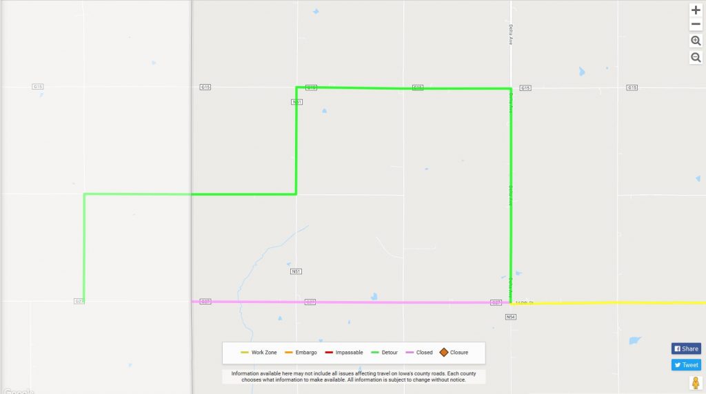 The Adair County Secondary Roads Department reports an upcoming construction project will start on Monday, April 20th, and last for 5-7 weeks, weather permitting. The slightly more than 7-mile long asphalt paving and resurfacing project on County Road (CR) G-27 (160th St.) starts at the Adair-Cass county line and continues east to Fontanelle Road. The portion from the Adair-Cass County line to Delta Ave. will be closed to through traffic. A detour for the closed portion will be as shown on the map below. The remaining portion will be open to traffic using flaggers and pilot cars.