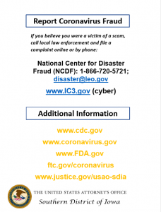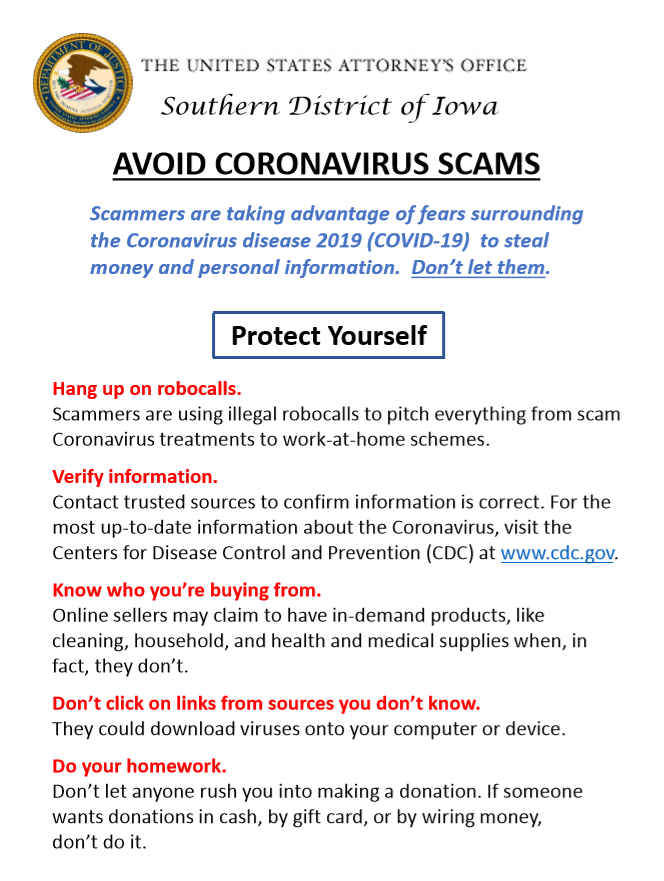 The U-S Attorney’s Office for the Southern District of Iowa has a brochure (pictured below) to help you protect yourself against COVID-19 scams.