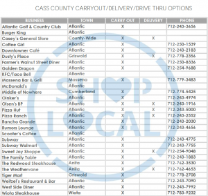 Multiple restaurants throughout Cass County are open for carry-out and delivery options only. Along with restaurants, all retailers in Atlantic are currently open and operating normal business hours. Numerous businesses have implemented online shopping resources, curbside assistance, delivery and phone-in order services. For service industry needs including: Vision, Dental, Veterinary Care, Chiropractic, Medical, Nails & Hair, contact the business directly before arrival.