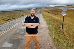 In this Sept. 25, 2017, photo, Bryan Farr, president of the Historic Route 20 Association in Chester, Mass, stands on an original alignment of U.S. Route 20 near Orin, Wy. Highway 20 was moved to the neighboring Interstate 25 where speed limits are set at 80 mph. “Almost every town has a story to tell,” Farr, said. (Bryan Farr via AP)