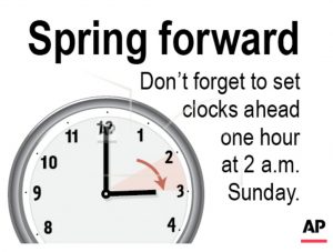 WASHINGTON (AP) — Like clockwork, Daylight Saving Time (DST) strikes again this weekend. Watch for it at 2 a.m. local time Sunday in most of the United States. Don’t forget to set your clocks an hour ahead, usually before bed Saturday night, to avoid being late for Sunday morning activities. With the annual change, sunlight will extend longer into the evening, but the shine will take longer to emerge in the morning.