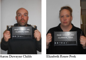 Page County Sheriff Lyle Palmer reports his office received a complaint Friday, from the Iowa Department of Human Services (DHS), in reference to an alleged incident of child abuse at a residence in Page County. During the investigation five minor children were taken into protective custody and turned over to the DHS for temporary placement. 36-year old Aaron Duwayne Childs, and 32-year old Elizabeth Renee Peek, both of Yorktown, were arrested.
