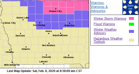 The National Weather Service says snow will develop tonight over northern Iowa then spread east and persist into Sunday. The snowfall rates will be moderate to heavy at times tonight into early Sunday, leading to a quick deterioration in travel conditions over far northern Iowa. Snow accumulations will be mainly confined to areas north of Highway 30. A transition to freezing drizzle may occur Sunday morning with minor ice accumulation possible. Increasing north wind during the day Sunday will lead to some blowing and drifting of snow especially in far northern Iowa where less freezing drizzle occurs.