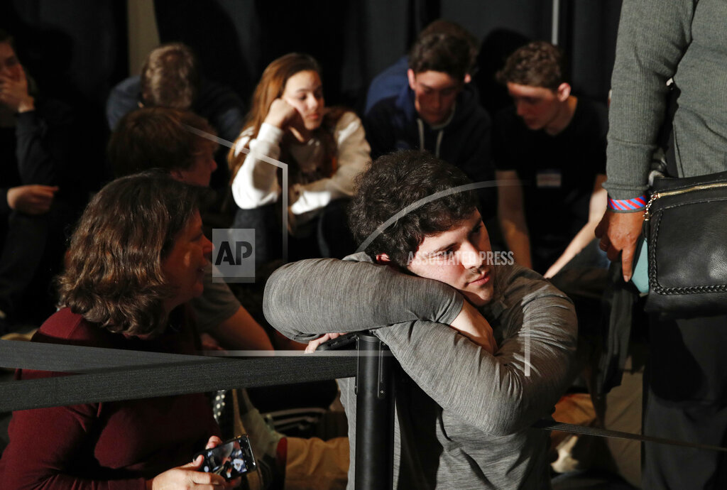 People wait for results at a caucus night campaign rally for democratic presidential candidate former Vice President Joe Biden on Monday, Feb. 3, 2020, in Des Moines, Iowa. (AP Photo/John Locher)