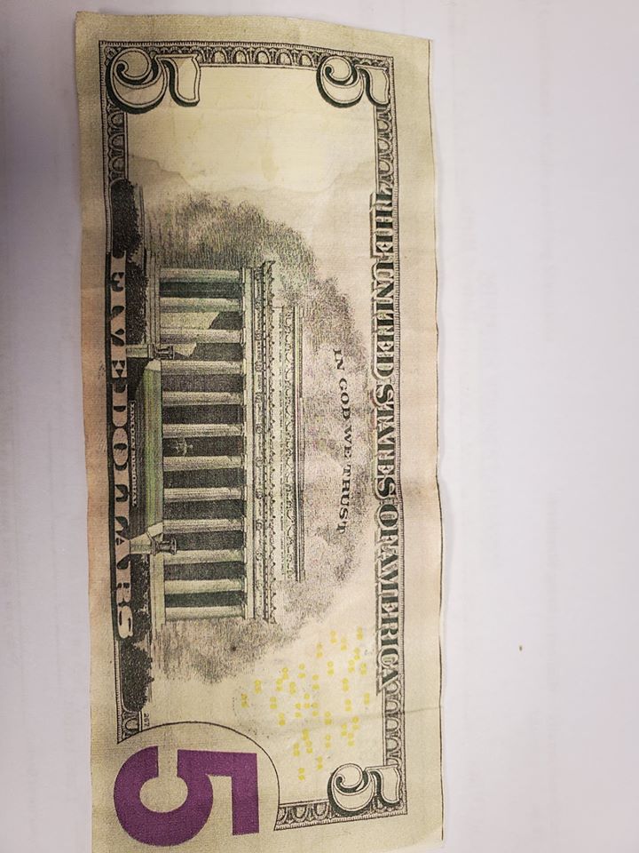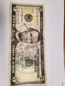 the recent use of counterfeit money at local businesses. Authorities advise merchants to “Please attempt to verify the validity of any money taken for merchandise. Please note that the back side of the five dollar bill will show an obvious cut line across the top. Also, if you hold the bill to the light, you can see through it more than you should, the watermark is lighter in color and there is no band running from top to bottom.”