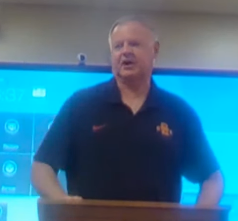 Screenshot of the YouTube Atlantic School Board mtg. Roger Warne discusses recommended 1-1 devices.