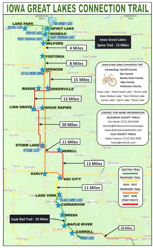 (Radio Iowa) – An ambitious new bicycle trail is proposed for northwest Iowa that would span five counties, following the Highway 71 corridor. The Iowa Great Lakes Connection Five-County Trail would complete a bike trail from Spirit Lake to Carroll through Dickinson, Clay, Buena Vista, Sac, and Carroll counties. Group organizer Kathy Fueston says trail supporters met last month in Storm Lake for the first time since 2013. “We had a great showing from all five counties,” Fueston says, “and certainly representation on how they saw their portion of the trail being built.” A new trail would run from Spencer to Lake View. The project would connect to existing trail systems on each end, including the Iowa Great Lakes Spine Trail to the north and the Sauk Rail Trail to the south. Smaller loops could connect other communities.