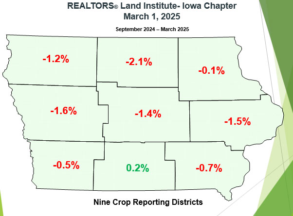 (Radio Iowa) – The recently REALTORS Land Institute survey shows the south-central district was the only one reporting a farmland price increase. Spokesman Matt Vegter says the state average value didn’t change much. “From September one to March one, the state of Iowa, for tillable land across all nine crop reporting districts, is down one percent, so pretty flat market,” he says. The south-central market was up two tenths of a percent, the north-central was down two-point-one percent, for the largest drop.