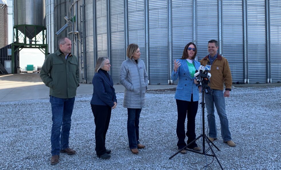 U.S. Agriculture Secretary Brooke Rollins speaks during news conference in Waukee, joined by (from left to right) Iowa Ag Sec. Naig, U.S. Rep. Mariannette Miller-Meeks, Iowa Gov. Reynolds and U.S. Rep. Zach Nunn. (RI photo)
