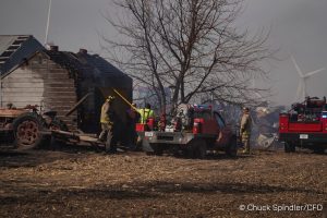 The fire was believed to have started from a downed power line, and high winds spread the fire to what is said to have been a two-mile line of flames. (Photos are by Chuck Spindler, via the Creston FD Facebook page)
