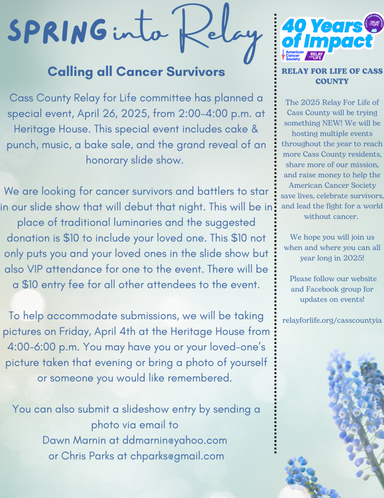 Officials say their first event this year will be Spring into Relay on April 26, 2025 at Heritage House in Atlantic. The event will be a social gathering featuring cake, punch, live music, and a debut viewing of an honorary cancer survivor/battler slideshow.