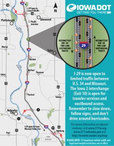 Due to ongoing flooding and pavement repairs, exit and entry points will be limited. The Iowa 2 interchange at exit 10 will be open for services and to allow traffic to flow east of the interstate. For those traveling north on I-29 they will be able to exit to use eastbound U.S. 34. All other exits through this section of I-29 remain closed.