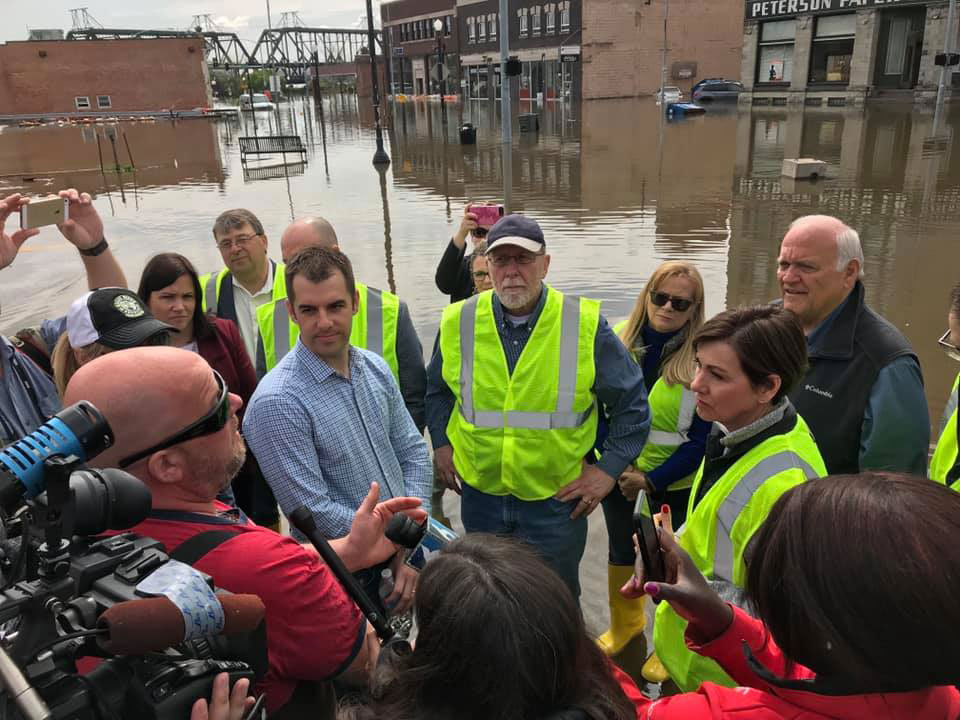 (Radio Iowa) — Wearing yellow boots and lime green vests, state officials toured flooded sections of downtown Davenport, Friday. Mayor Frank Klipsch was the guide for Governor Kim Reynolds, Lieutenant Governor Adam Gregg, and Second District Congressman Dave Loebsack. Several blocks lined with businesses and apartments have been surrounded by Mississippi River floodwater since a temporary floodwall failed on Tuesday.
