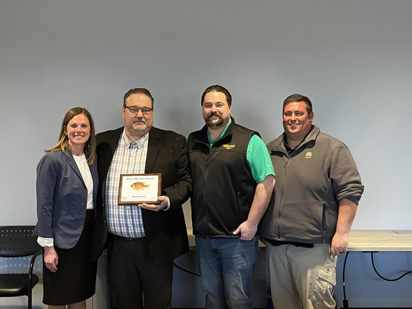 Pictured from the left is DNR director Kayla Lyon, 2025 Brass Bluegill Award recipient Bob Harris, chair of the Natural Resource Commission, Marcus Branstad, and DNR fisheries biologist Andy Jansen. Photo courtesy of the Iowa DNR.