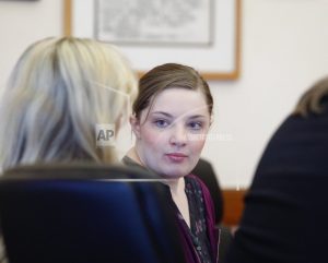 Cheyanne Harris talks with her attorney during her court appearance on Wednesday, Jan. 30, 2019 in Le Mars, Iowa. Harris, the mother of a baby whose lifeless body was found in an infant swing wearing a maggot-infested diaper is standing trial in his death. Court records say Harris has pleaded not guilty to first-degree murder and child endangerment resulting in death. The trial was moved to Le Mars in Plymouth County from Chickasaw County because of publicity. (Jeff Reinitz/The Courier via AP)