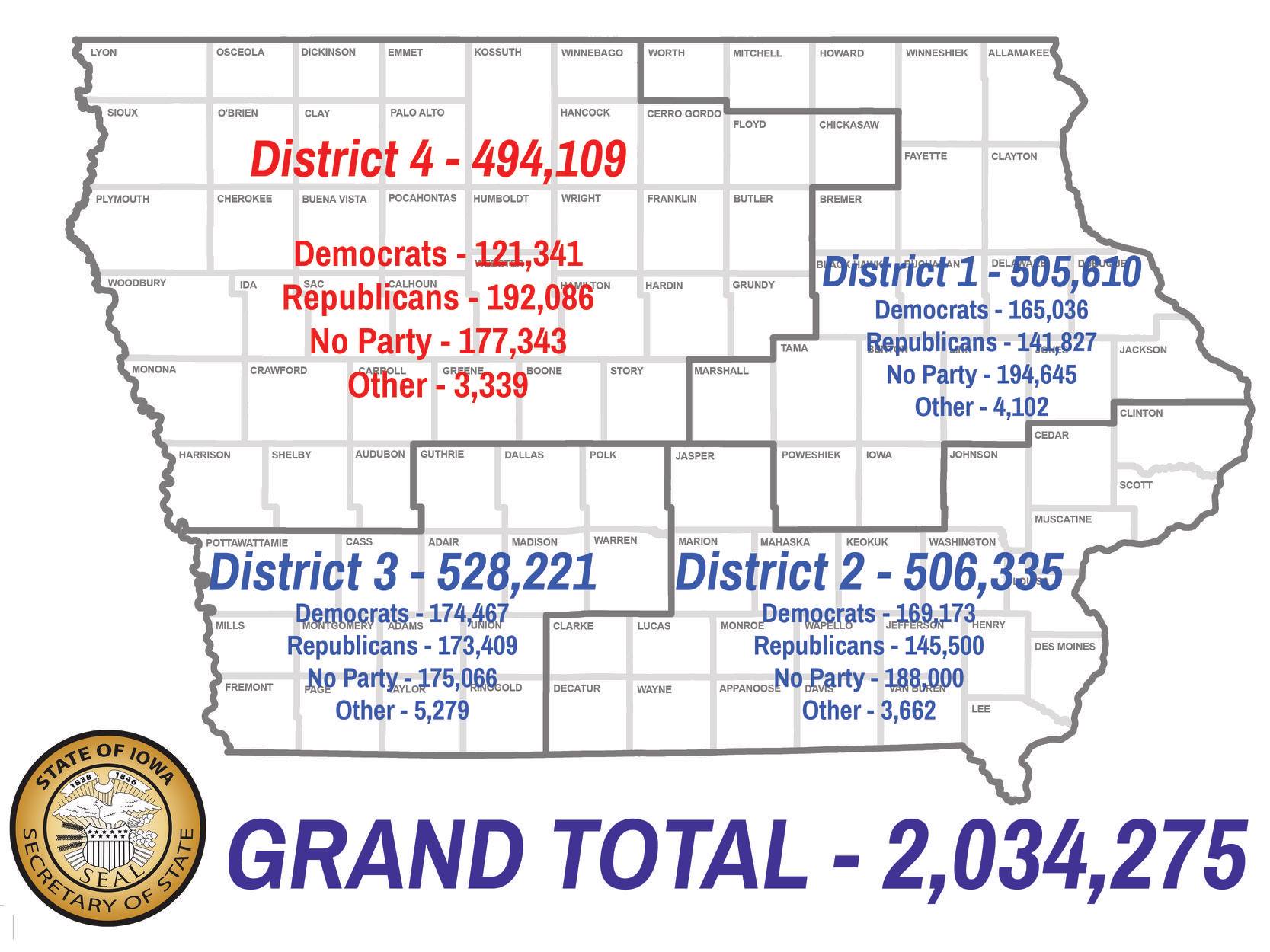 New statewide voter registration totals are available. Iowa Secretary of State Paul Pate said today (Friday) the 2,034,275 active registered voters is one of the highest marks in Iowa history. The information shows there are more “No Party” affiliation voters (175,066) in District 3 (which includes Cass County) then there are Democrats (174,467) and Republicans (173, 409). Other party affiliations amounted to 5,279.The total number of registered voters in District 3 is 528,221.
