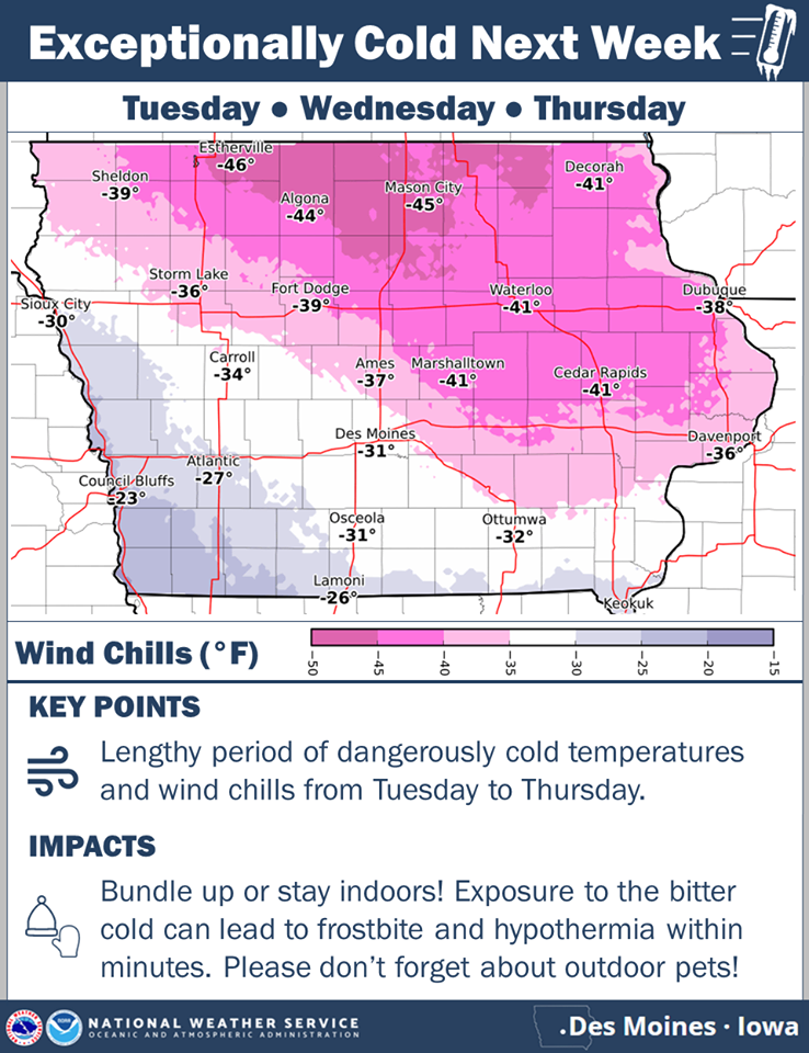 Officials with the National Weather Service say extremely cold temperatures and wind chills are forecast by Tuesday and look to last through the end of next week. Highs by Wednesday are likely to remain below zero for much of the state and wind chill values look to plummet to 25 to 45 below zero Tuesday night and Wednesday night. This long duration temperatures and wind chills will be some of the coldest readings in recent years.