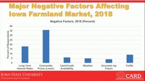 “The second largest factor that people mention is a higher interest rate,” according to Zhang. “Over the last year, over the last three years actually, the Federal Reserve has been raising the interest rates.” He says the trade wars have also played some role. “The impacts of the tariffs on the economy is felt more by the agricultural states like Iowa,” Zhang explains. He expects land values to see another small dip next year — as he says new tariffs and other factors take some time before they are felt in land values.