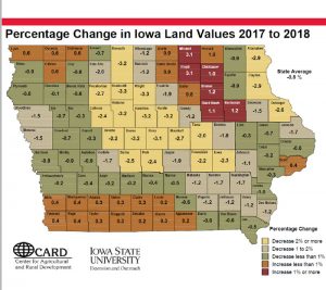 Humboldt and Wright Counties reported the largest percentage decrease in value at three-point-three percent. Zhang says there has been a drop in farm income that’s led to the drop in land values brought on in part by big crops. He says we’ve seen the six and seventh largest crops in the last six or seven years and he says there’s also been a rebound in the beef and pork markets, as well as an increase in pork processing. Zhang says the cost of money is another issue driving land prices.