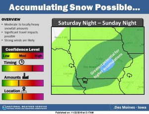 The National Weather Service in Des Moines reports a potential winter storm may impact the state Saturday night into Sunday night. Officials say “At this time, confidence is increasing that this system will impact central and southern Iowa with the potential for moderate snowfall and strong winds.” If you have travel plans from Saturday night through Sunday night, please monitor the weather forecast very closely. This system, according to the Weather Service, may cause significant travel impacts during this time period. Have alternate travel plans in place, and if you must travel, have a full tank of gas in your vehicle, and keep a winter weather survival kit in your vehicle.
