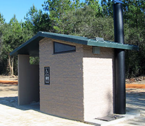 • Floorplan 6′ 6″ x 14′ 8″; • 1 toilet riser (ADA compliant); • ADA grab bars; • 1 waste clean out hatch and • 1 concrete waste vault (1,000 gallon capacity).