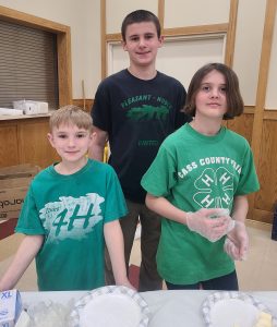 Members of Pleasant Noble United helping serve butter, silverware, and sausage at the 2024 Annual Cass County 4-H Endowment Pancake Supper. Left to Right: Hunter Wise, Gage Ritter, Emma Ritter. (Photo courtesy Katie Bateman)