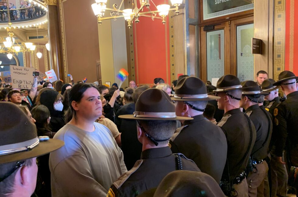 (Des Moines, Iowa; Iowa Capital Dispatch) – Hundreds protested in the halls of the Iowa State Capitol today (Monday) as a subcommittee advanced legislation to remove gender identity as a protected class from the Iowa Civil Rights Act.