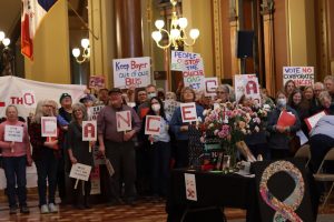 Iowans protest a Senate bill on Feb. 10, 2024, that would shield pesticide companies from certain lawsuits. (Photo by Cami Koons/Iowa Capital Dispatch)