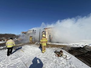 (Elliott, Iowa) – Firefighters from Red Oak, Elliott and Grant responded to a reported structure fire southwest of Elliott this (Wednesday) afternoon. The call about a steel utility building fire at 2015 137th Street went out at around 2:20-p.m. According to the Red Oak Fire Department’s Facebook page, when firefighters arrived, they found the structure fully engulfed in flames, and the roof had collapsed. (Photos are from the Red Oak FD Facebook page)