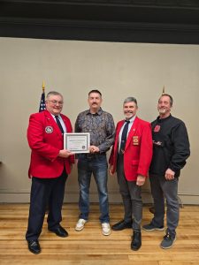 Roger Bissen, IFA representative, Jeremiah Thompsen, receiving 20 year certificate & pin, Mark McNees, IFA Representative and AFD Chief, Cappel