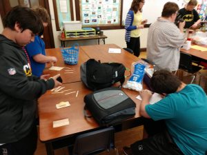 Students have an hour to design and test a package to safely ship a single potato chip through the USPS to another school. Upon receipt, the chip will be evaluated and scored. The goal is to engineer a package to have the smallest mass and volume, while at the same time protecting the chip. The package can be no larger than 3×5″, and there must be no writing on the package, such as fragile, or handle with care. A perfect chips scores 100 points, slightly damaged 50 pts, split chip 10 pts, major damage 5 points, dust 1 pt. Overall scores = Intactness score/(mass in kg x volume in cc).,