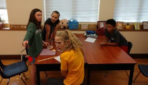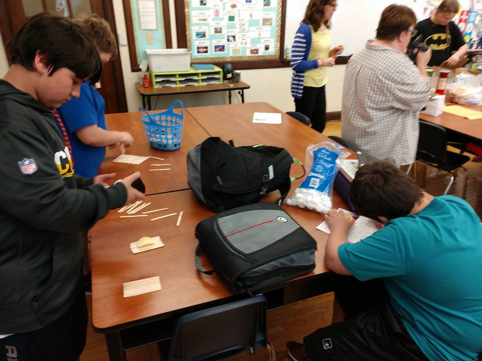 In these pictures, students in the after school STEM class discuss and begin work on a container that will hopefully allow their single potato chip to be mailed and arrive in one piece. (Ric Hanson/photos) [Click on each image to enlarge]