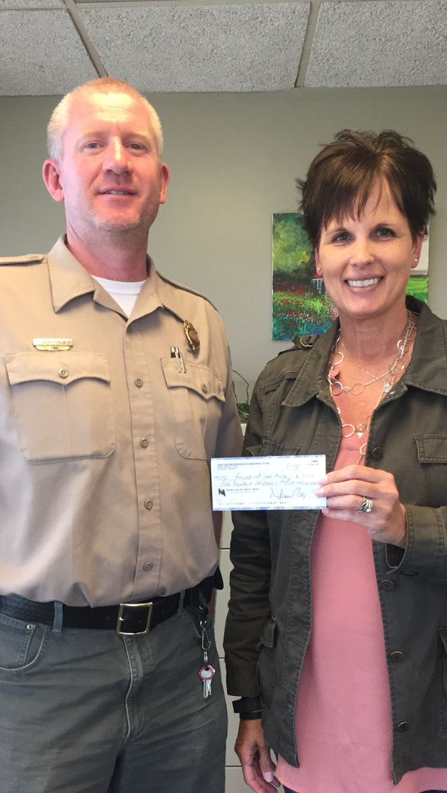 Lake Anita Park Mgr. Josh Peach (Left), receives a check from Melanie Petty with the Trevor Frederickson Memorial Fund. (Photo submitted)