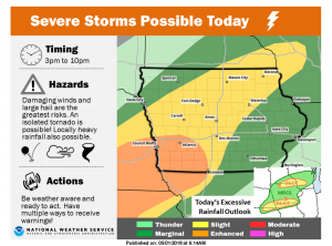 The National Weather Service says strong to severe thunderstorms are expected to develop across much of western and central Iowa late this afternoon into this evening. The main threats will be large hail and damaging winds, although an isolated tornado or two remain possible. Localized heavy rain will also be possible into the overnight hours as the thunderstorms persists. Stay tuned for weather watches and warning, and be prepared to seek shelter when severe storms approach. KJAN will keep you informed on-air and on our social media apps.