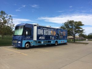 DES MOINES – Now that spring has sprung, the State Historical Society of Iowa’s “Iowa History 101” mobile museum is on the road again, resuming its three-year mission to visit all 99 Iowa counties by the end of next year. Launched in 2017, the 300-square-foot museum is housed in a bright-blue, custom-built Winnebago that travels the state’s highways and back roads to share stories from Iowa’s past. It visits schools, libraries, local museums, community festivals, county fairs and other gathering places to show Iowans multi-media presentations and artifacts from the historical society’s collection. State Historical Society of Iowa Administrator Susan Kloewer said “The mobile museum shares some of the essential stories that every Iowan should know about who we are and what we’ve achieved since Iowa became a state more than 170 years ago. It’s one of the best ways we can share the history of Iowa with people in their own communities.”