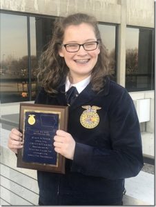 AMES, IA – The Iowa FFA Creed Speaking Leadership Event was held at Iowa State University, Ames, on Monday, April 23, 2018. Eighteen individuals participated in this year’s Career Development Event (CDE). The first place individual for the event was Anna Campbell from the Audubon FFA Chapter. Their agriculture education instructor and FFA advisor is Mrs. Brittany Elmquist.The second place individual for the event was Carter Wagner from the Harlan FFA Chapter. Their agriculture education instructors and FFA advisors are Ms. Justine McCall and Mr. James Shughart.