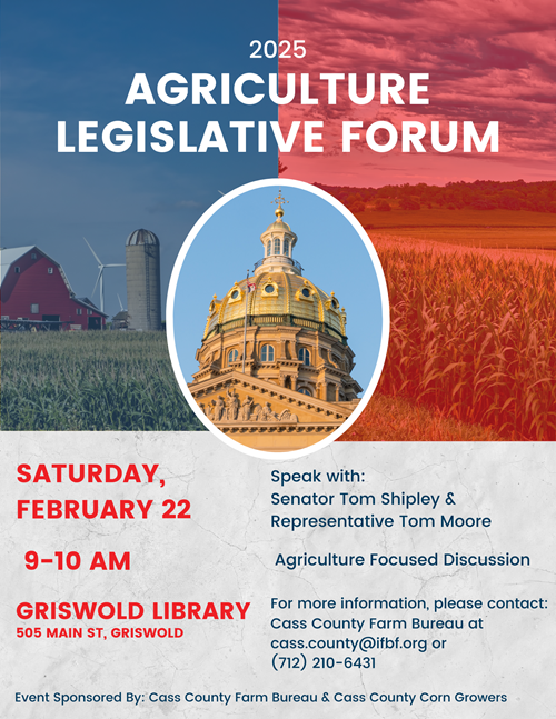 (Griswold, Iowa) – An upcoming Agriculture Legislative Forum will be held on February 22nd at 9:00am at the Griswold Public Library. For more information, see the flyer below: