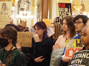 wa students and supporters rallied at the Iowa State Capitol in Des Moines Jan. 8, 2024, calling for lawmakers to pass gun regulations in the wake of the Perry High School shooting the week before. (Photo by Robin Opsahl/Iowa Capital Dispatch)