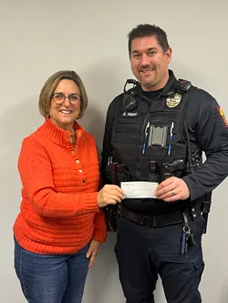 (Atlantic, Iowa) – The Xi Beta Phi women’s service organization recently donated over $1600 to the Atlantic School Resource Officer Program. The funds were proceeds from the group’s annual holiday greens sales fundraiser. Sara Nelson presented the donation to Atlantic Police Chief Devin Hogue. (Photo courtesy of Sara Nelson)