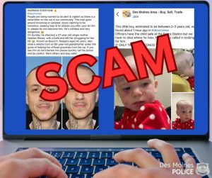 (Radio Iowa) – Authorities in central Iowa are warning social media users about two recent scams that are tugging at heartstrings and preying on fears. One fraudulent post asks for the community’s help identifying an abandoned and injured child, while the other claims a serial killer is on the run. Des Moines police say the details are changed to make it appear local, but the same scams are being used in multiple states.