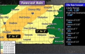 If you’re heading outside today, tonight, or tomorrow morning, you’ll need your umbrella. The National Weather Service in Des Moines says Light showers continued overnight across much of Iowa, and will continue into the day today. A few strong to possibly severe thunderstorms are possible late this afternoon across southwestern to southern Iowa. Rainfall amounts tonight should be a widespread 1 to 1.5 inches. Another 0.1 to 0.25 inches of rain may fall from the 7 am to noon Saturday time period. In all 2 to 3 inches of rain is expected from Atlantic to Denison to Fort Dodge to Mason City.