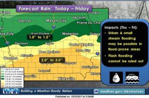 We will get a break from the rain on Wednesday, before moderate to heavy rainfall moves in during the day Thursday, lasting overnight into much of Friday. Officials say this time period will likely bring the highest rainfall totals to Iowa during this week, primarily along and south of Interstate 80. Urban and small streams may flood, and flash flooding/river flooding cannot be ruled out at this time.