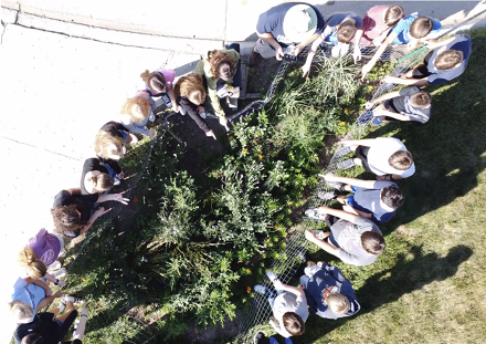 Students observe a “pocket prairie” installed by teacher Mark Dorhout who leads an outdoor education program at the middle school in Panora. (Photo courtesy of Mark Dorhout)