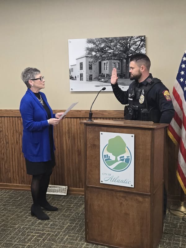 (Atlantic, Iowa) – The Mayor of Atlantic issued the Oath of Office Wednesday evening to the City’s newest Police Officer. Grace Garret spoke about Christian Holzapfel’s background before swearing him-in.