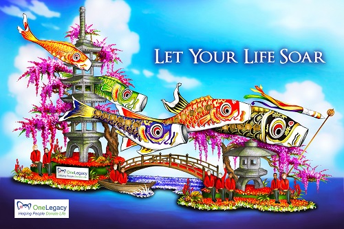 The 2025 OneLegacy Donate Life float, Let Your Life Soar, features a vibrant scene inspired by the beloved Japanese celebration of Children’s Day. Colorful Koi No Bori (Flying Fish Flags), or windsocks shaped like fish, fly overhead. Streamers bear the family crest, followed by Koi No Bori in a sequence representing father, mother, and children in order of birth. On the OneLegacy float, the koi fish scales will highlight memorial floragraph portraits. Floragraph portraits made from organic materials represent donors who gave the gift of life. The windsocks will soar over a garden of flowering trees featuring stone lanterns and a beautiful bridge.
