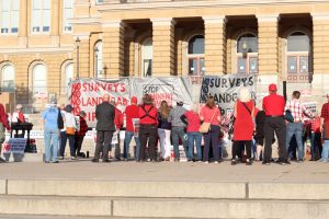 Opponents of a proposed carbon sequestration pipeline gather for a rally outside of the Iowa Capitol on Oct. 8, 2024. (Photo by Cami Koons/Iowa Capital Dispatch)